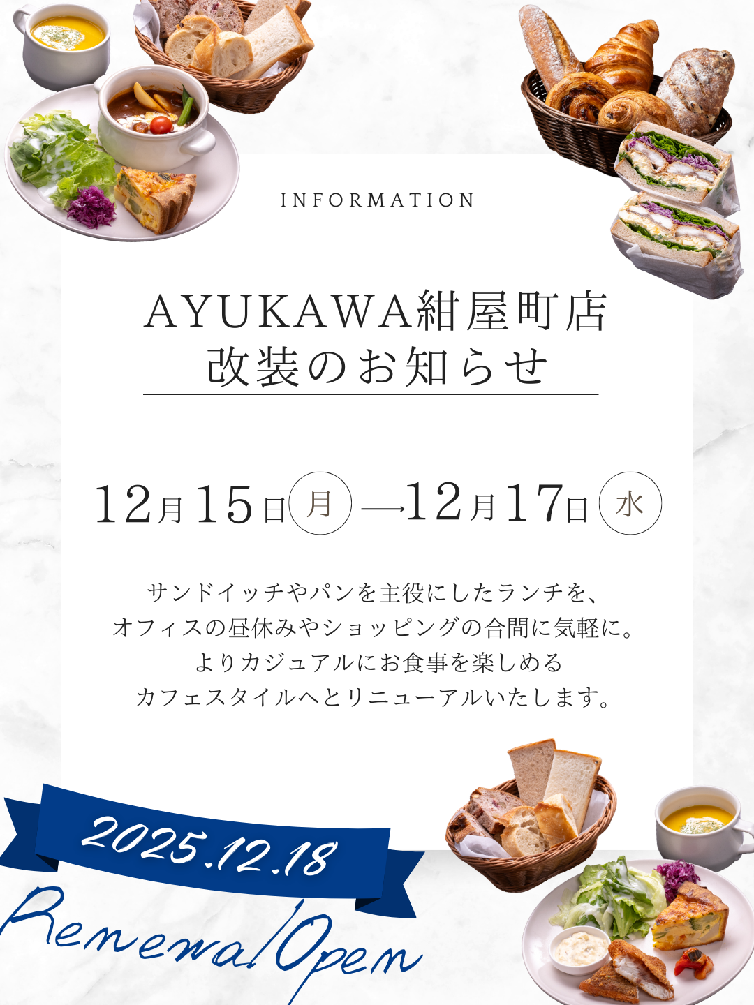 ベーカリー&カフェレストランAYUKAWA紺屋町店 12/18(木)Renewal OPEN
