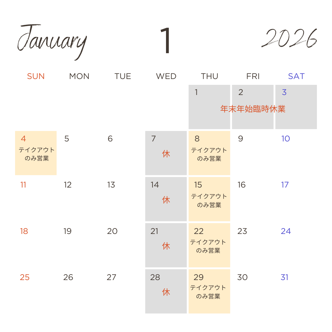 【臨時営業】1月4日(日) テイクアウトのみ